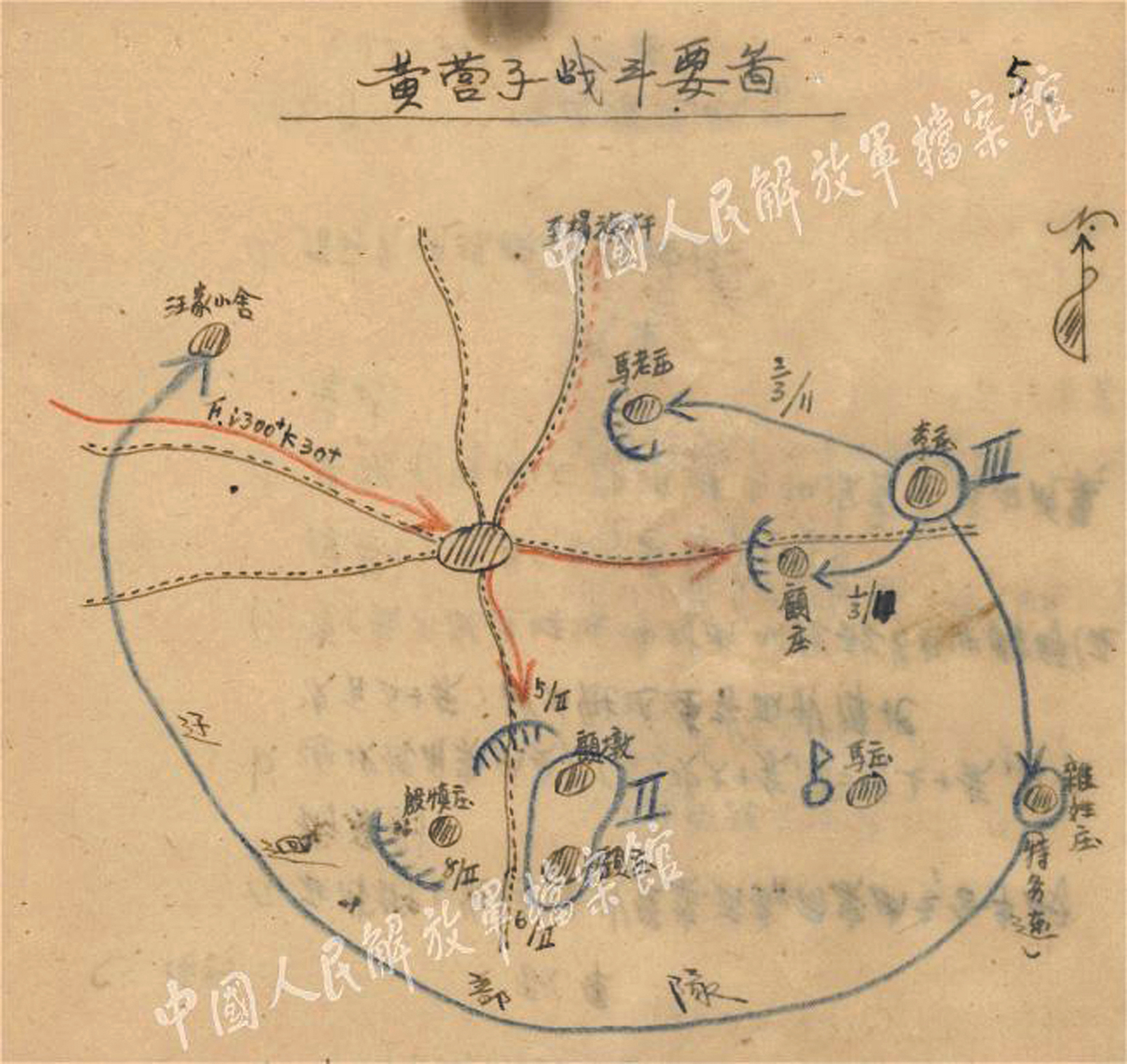 一九四三年新四軍司令部《鹽阜分區(qū)反掃蕩戰(zhàn)役詳報(bào)》內(nèi)頁之黃營(yíng)子戰(zhàn)斗要圖。
