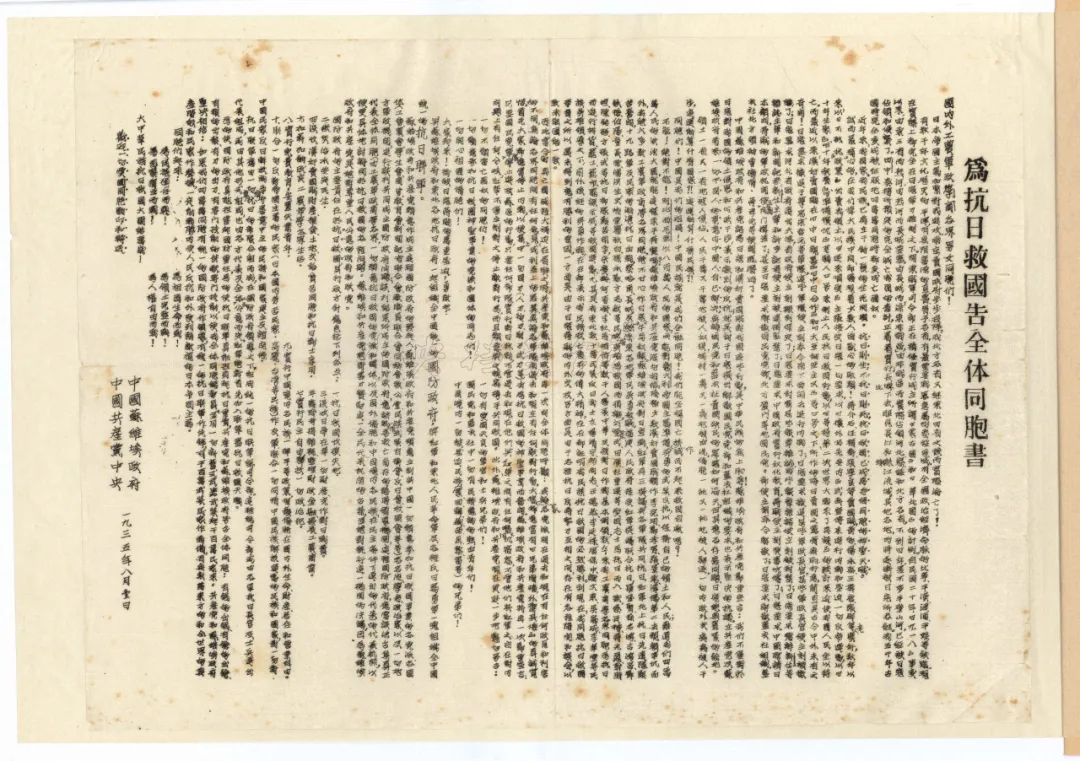 1935年8月1日,《中國蘇維埃政府、中國共產(chǎn)黨中央為抗日救國告全體同胞書》。來源:中國檔案雜志