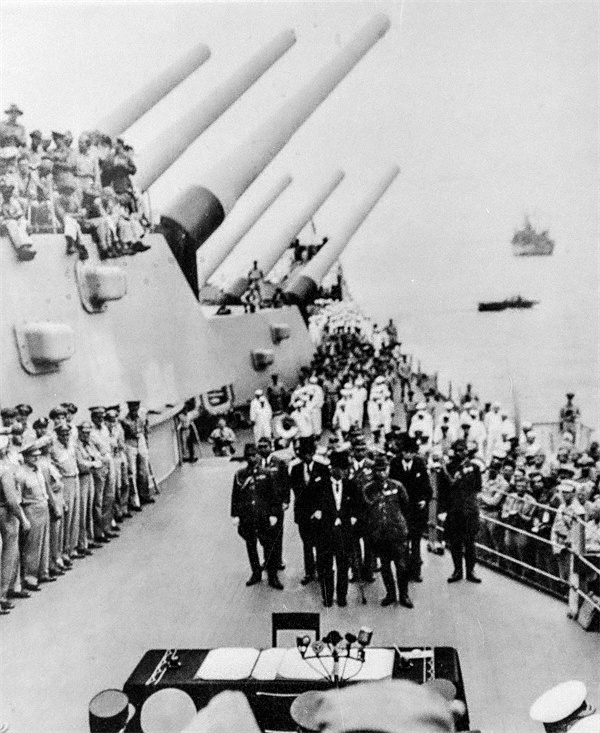 9月2日9時(shí),停泊于東京灣的美國(guó)“密蘇里”號(hào)戰(zhàn)列艦上,在包括中國(guó)在內(nèi)的9個(gè)受降國(guó)代表注視下,日本外相重光葵代表日本天皇和政府、參謀總長(zhǎng)梅津美治郎代表日本帝國(guó)大本營(yíng),分別在投降書(shū)上簽下名字。簽字結(jié)束后,數(shù)千架美式飛機(jī)飛越“密蘇里”號(hào)戰(zhàn)列艦上空,慶祝這個(gè)具有偉大歷史意義的時(shí)刻。同日,日本天皇發(fā)布詔書(shū),命令日本臣民“速停敵對(duì)行為,放下武器”,著實(shí)履行投降書(shū)之一切條款。
