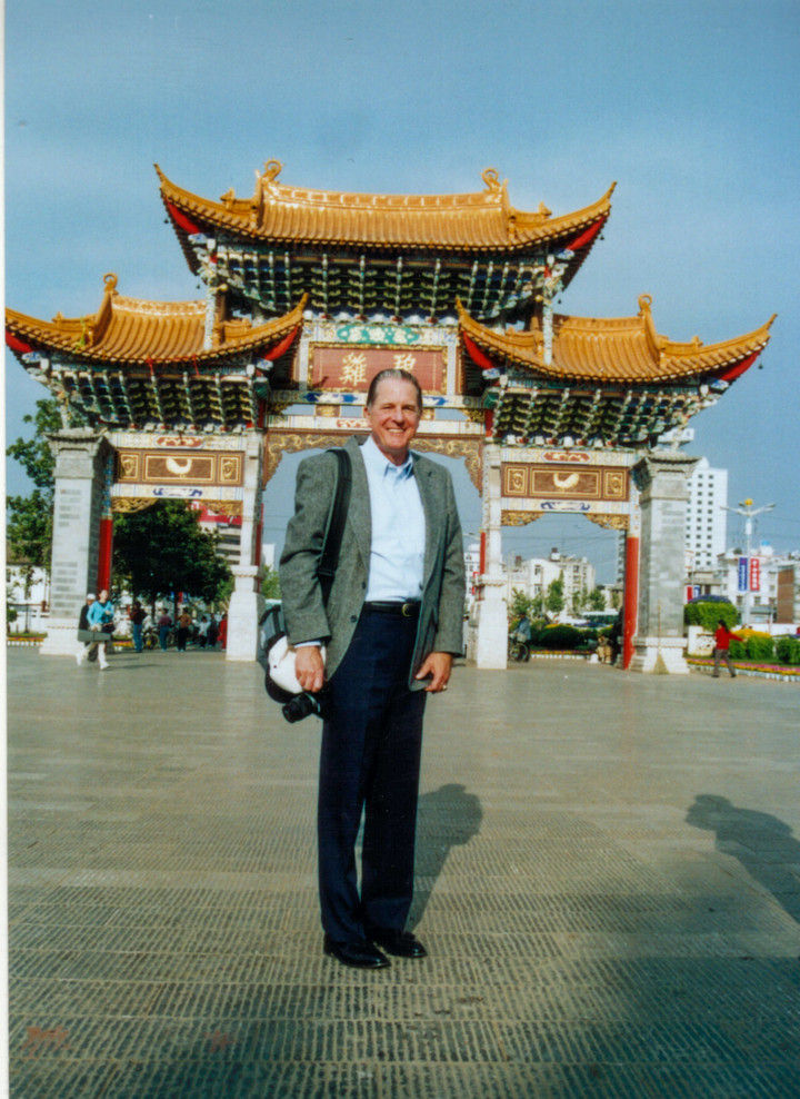 2003年3月,史迪威將軍的外孫約翰·伊斯特布魯克來到“史迪威公路終點站”——昆明碧雞牌坊。新華社發(fā)