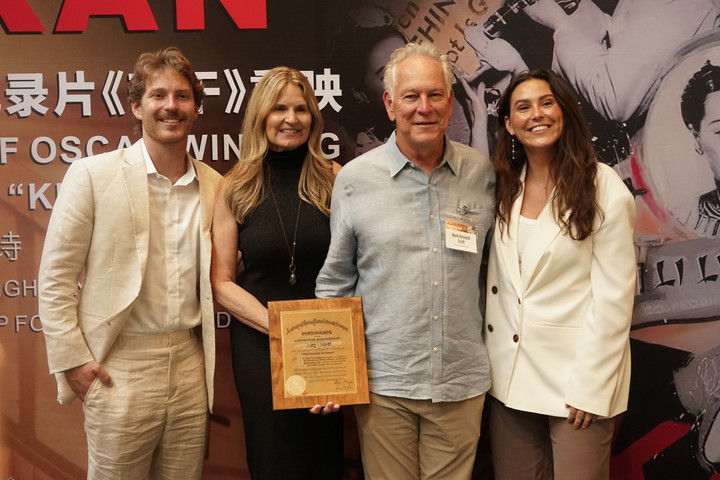 6月24日,在美國洛杉磯,《苦干》攝影師斯科特的兒子馬克·斯科特(右二)在首映前與家人合影。新華社發(fā)