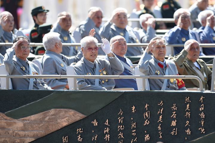 2015年9月3日,中國人民抗日戰(zhàn)爭暨世界反法西斯戰(zhàn)爭勝利70周年紀念大會在北京隆重舉行。這是抗戰(zhàn)老兵乘車方隊通過天安門廣場。新華社記者申宏攝