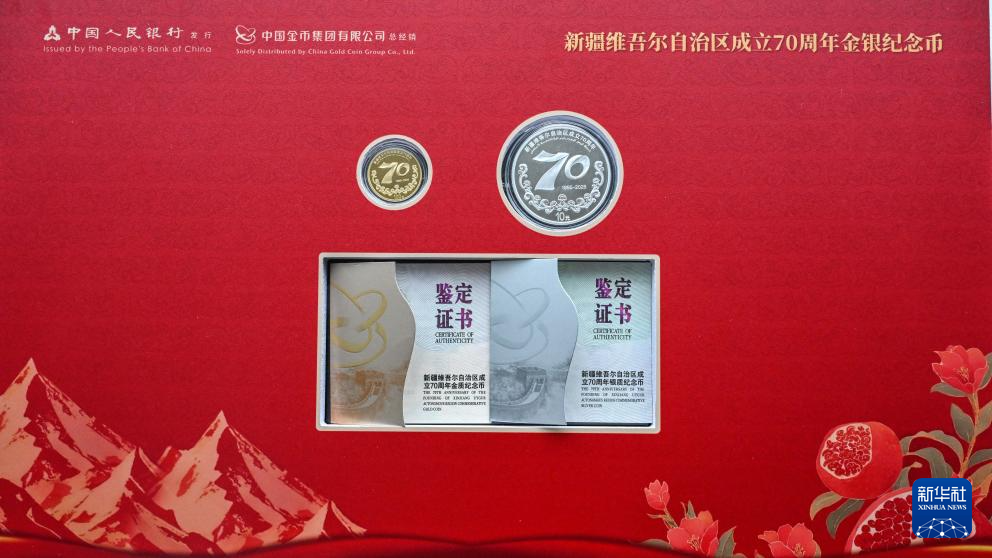 這是9月19日拍攝的新疆維吾爾自治區(qū)成立70周年金銀紀(jì)念幣。