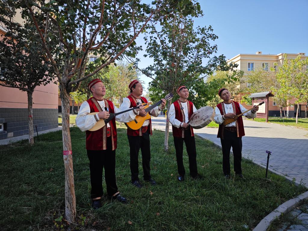 四名表演者來自達(dá)爾汗文藝隊,他們身著有著濃郁民族特色的傳統(tǒng)服飾,情緒飽滿地自彈自唱。領(lǐng)隊加爾肯別克·納斯依奧拉懷抱冬不拉,指腹在琴弦上靈活跳躍。有的隊員敲擊薩滿鼓,還有隊員彈奏吉他,不同風(fēng)格的樂器聲音交織在一起,配上帶著草原特有遼闊感的嗓音,心聲隨旋律自然流露。