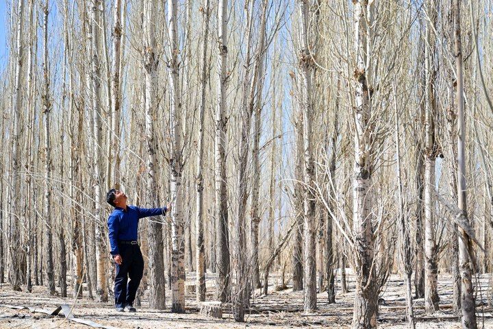 新疆巴音郭楞蒙古自治州和靜縣防沙治沙造林區(qū)(4月11日攝)。新華社記者丁磊攝