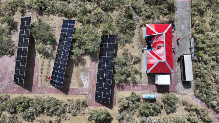這是2023年8月20日拍攝的中國石油塔里木油田零碳沙漠公路光伏發(fā)電站。新華社記者顧煜攝