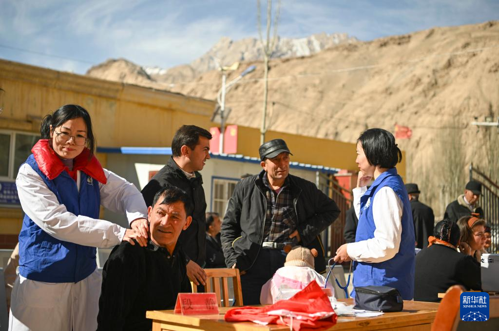 在新疆塔什庫爾干塔吉克自治縣庫科西魯格鄉(xiāng)衛(wèi)生院,深圳援疆中醫(yī)康復(fù)科醫(yī)生段靜(左一)為村民診療(2025年3月24日攝)。