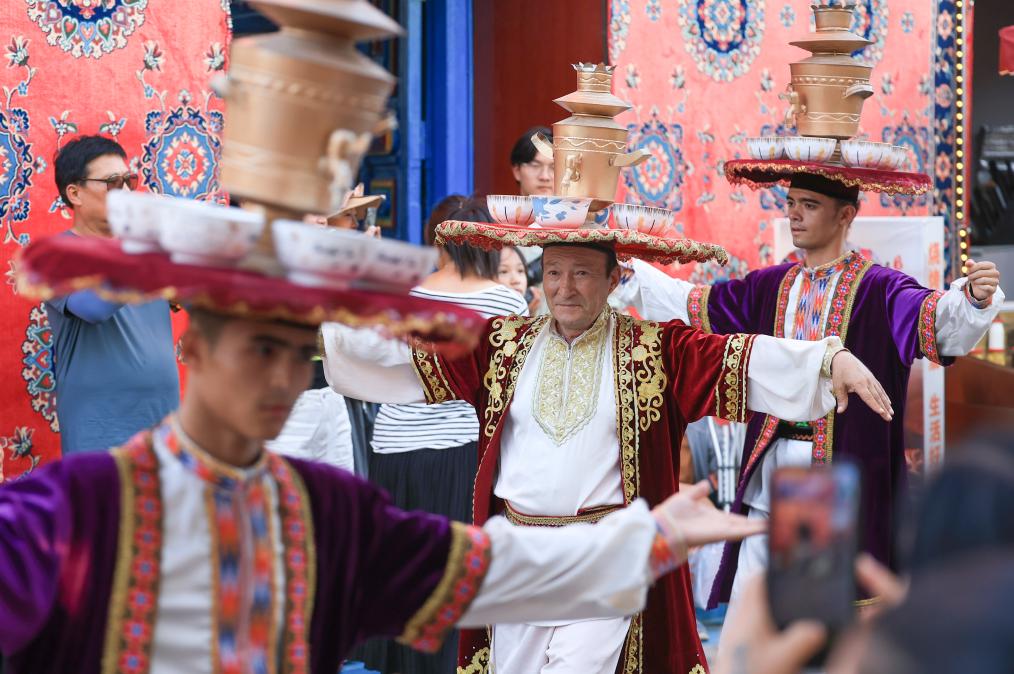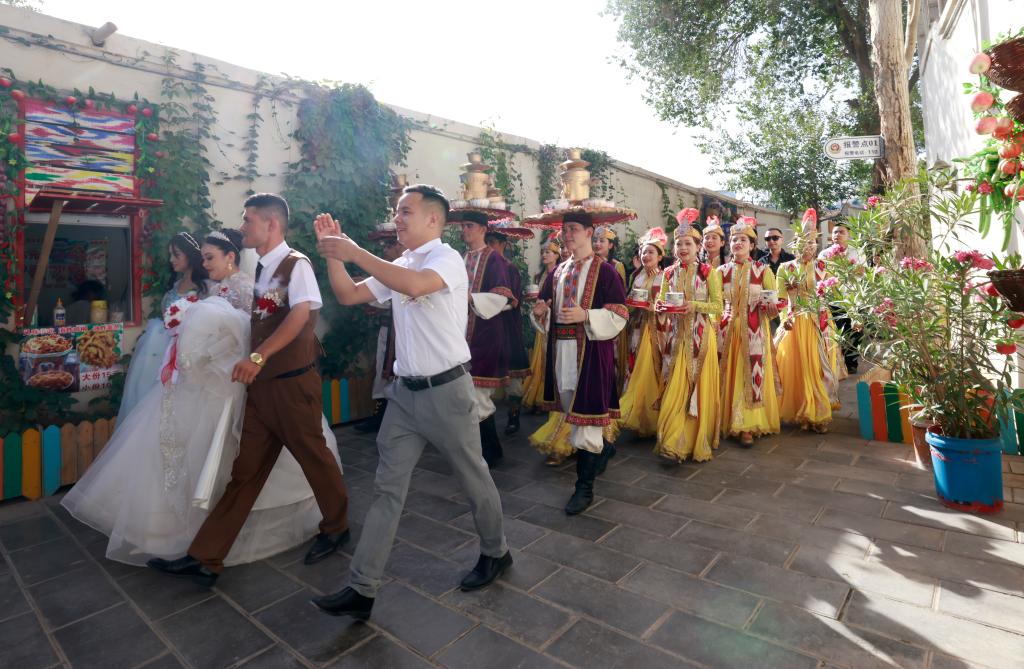 7月22日,在新疆庫車市的龜茲小巷,表演薩瑪瓦爾舞的演員參與當(dāng)?shù)氐囊粓?chǎng)婚禮活動(dòng)。新華社記者 王菲 攝