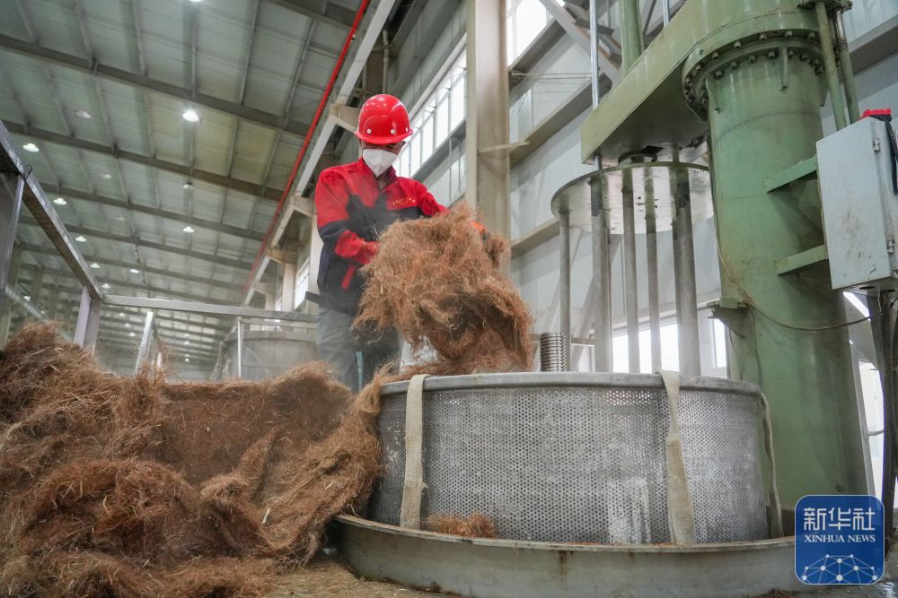 ↑ 9月20日,在新疆尉犁一家服裝公司的羅布麻纖維脫膠車間,工人加工原材料。新華社發(fā)(汪志鵬 攝)