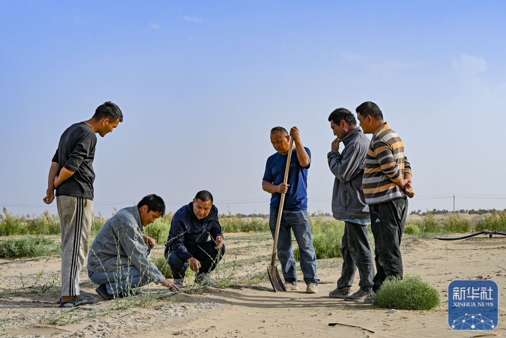 ↑ 9月20日,新疆尉犁縣國(guó)有林管理局護(hù)林員艾力·尼亞孜(左三)和工作人員一起查看羅布麻長(zhǎng)勢(shì)。新華社記者 陳朔 攝