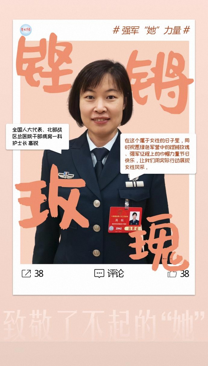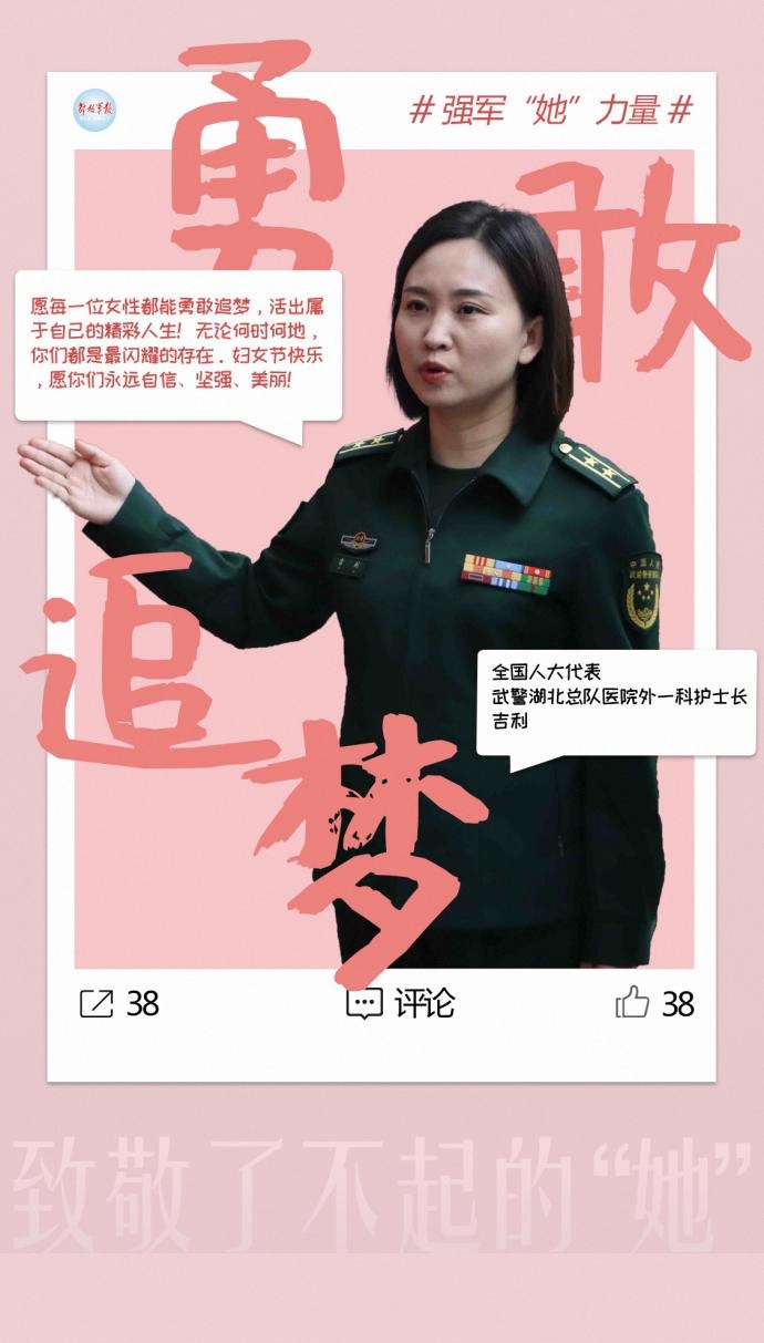 “在這個屬于女性的日子里,同時祝愿綠色軍營中的鏗鏘玫瑰、強軍征程上的巾幗力量節(jié)日快樂,讓我們用實際行動展現(xiàn)女性風(fēng)采。”