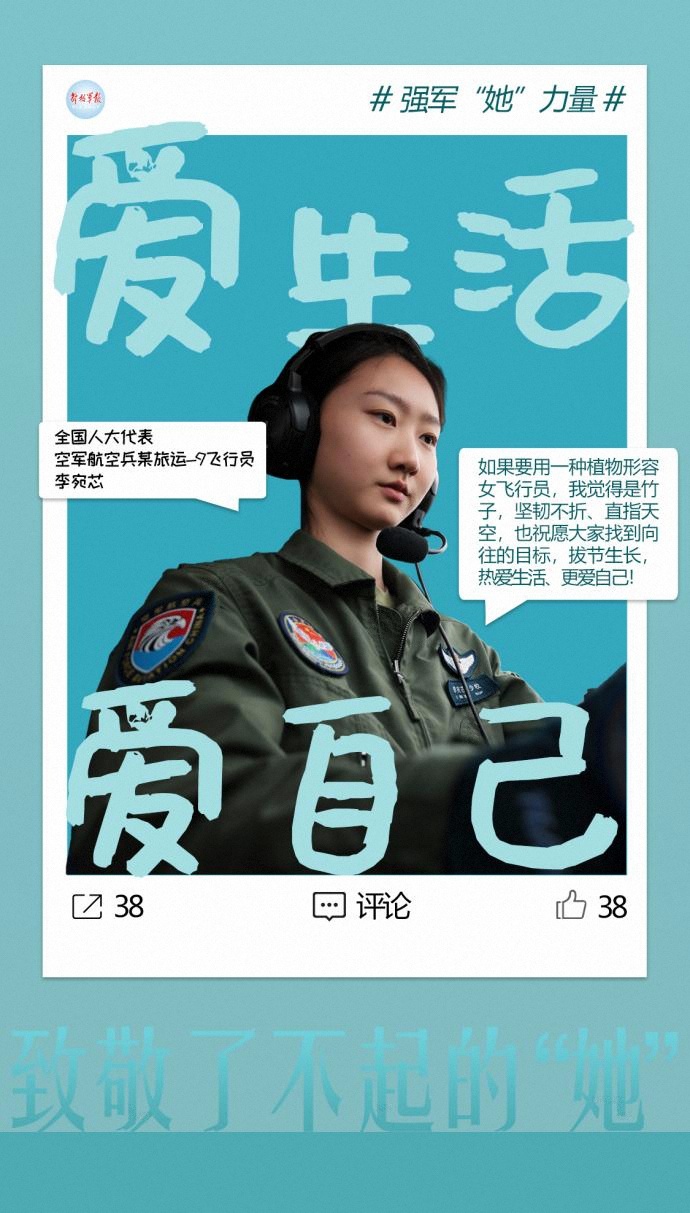 “如果要用一種植物形容女飛行員,我覺得是竹子,堅韌不折、直指天空,也祝愿大家找到向往的目標,拔節(jié)生長,熱愛生活、更愛自己!”
