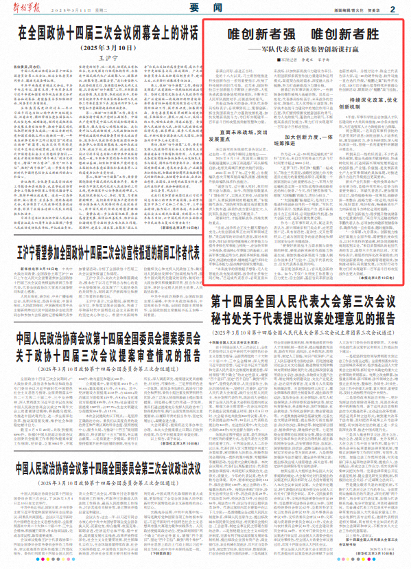 共赴這場(chǎng)春天的盛會(huì),軍隊(duì)代表委員紛紛表示,必須乘勢(shì)而上、集智創(chuàng)新,抓住我國(guó)新質(zhì)生產(chǎn)力蓬勃發(fā)展機(jī)遇,加快發(fā)展新質(zhì)戰(zhàn)斗力,為打好實(shí)現(xiàn)建軍一百年奮斗目標(biāo)攻堅(jiān)戰(zhàn)貢獻(xiàn)智慧和力量。