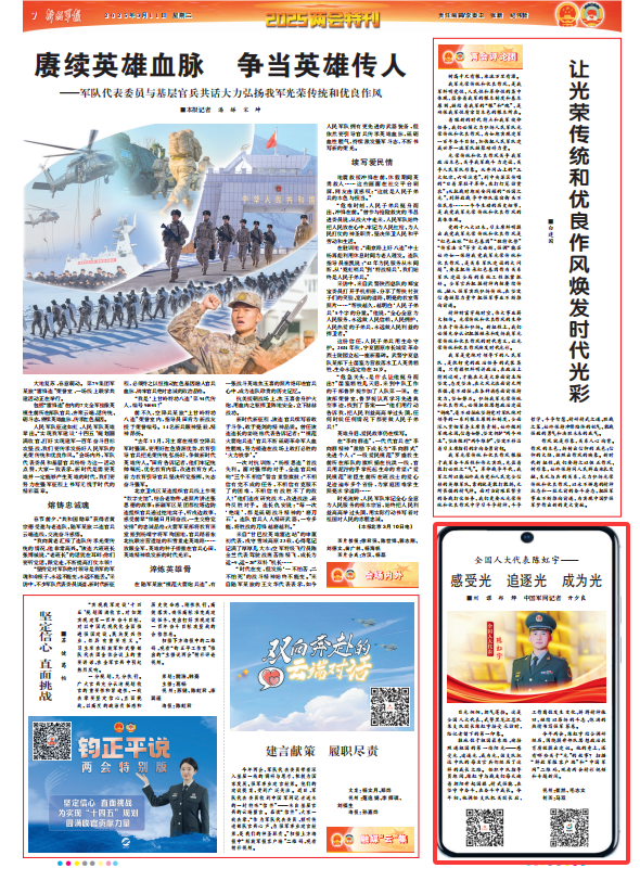 今年兩會,陳虹宇結(jié)合調(diào)研經(jīng)歷,圍繞提升部隊(duì)思想政治教育質(zhì)效提出建議。他的身上,還有哪些關(guān)于“光”的故事?掃描“解放軍報客戶端”和“中國軍網(wǎng)”二維碼,觀看兩會精彩視頻和專題新聞。