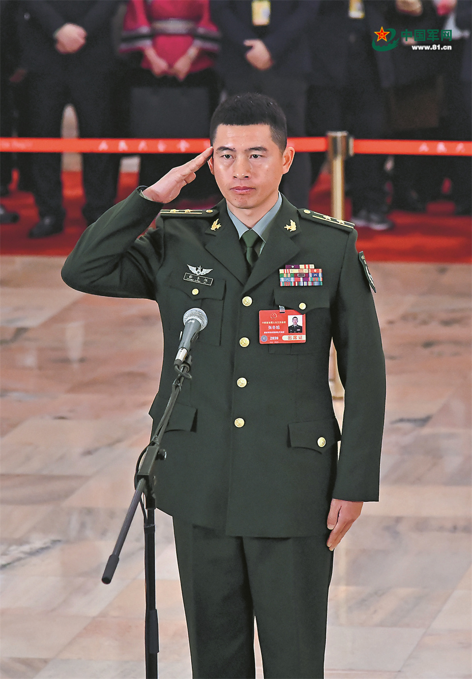 3月5日,十四屆全國人大三次會議首場“代表通道”集中采訪活動在北京人民大會堂舉行。圖為軍隊人大代表張冬旭接受采訪。解放軍報記者 王俊 攝