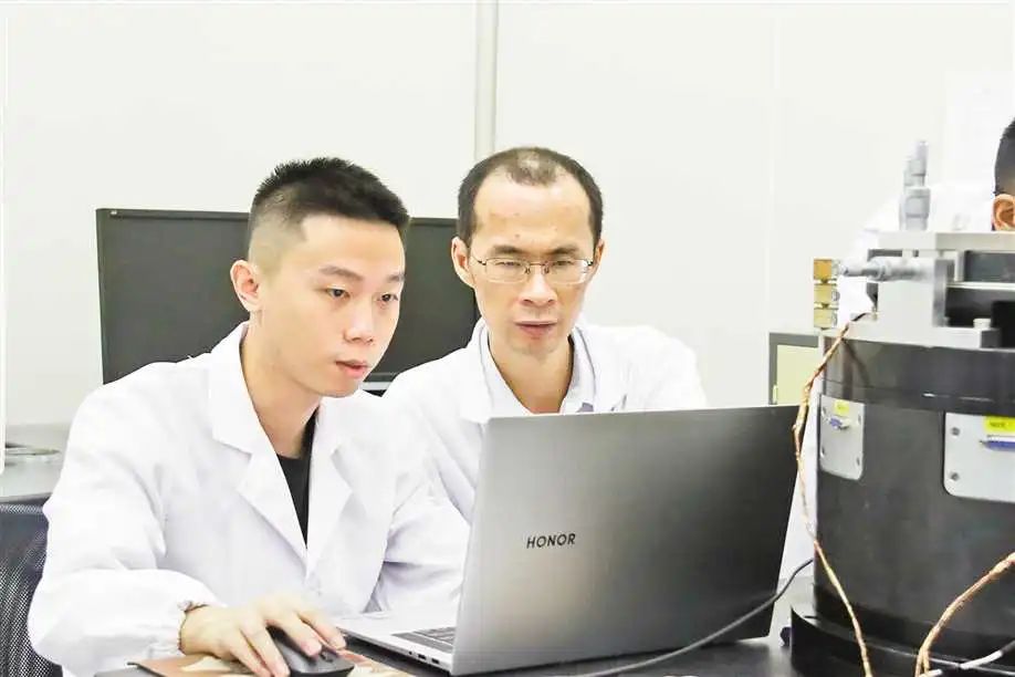 圖為劉小康(右)在指導(dǎo)學(xué)生做實(shí)驗(yàn)。(重慶理工大學(xué)供圖)