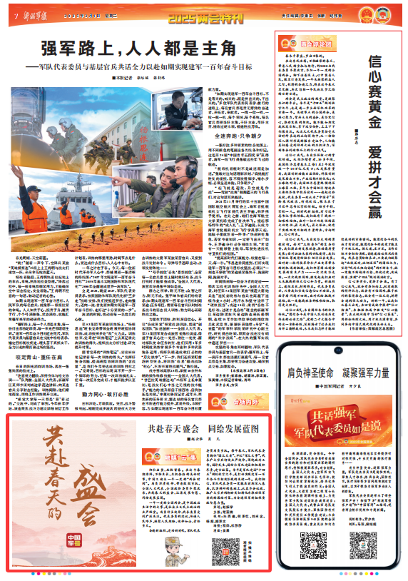 奮進新征程,建功新時代,軍隊代表委員肩負重托。每年春天,軍隊代表委員胸懷“國之大者”、牢記“軍之大事”,代表廣大官兵行使莊嚴使命,圍繞政府工作、國計民生、國防和軍隊建設積極履職盡責、建言獻策。今年是軍隊建設“十四五”規(guī)劃收官之年,是打好實現(xiàn)建軍一百年奮斗目標攻堅戰(zhàn)的關(guān)鍵一年。我們相信,軍隊代表委員一定能在前期深入基層、扎實調(diào)研的基礎上,認真參會議政,把廣大官兵的期盼關(guān)切轉(zhuǎn)化為推動強軍實踐的思路對策,為奮進強軍新征程貢獻智慧力量。