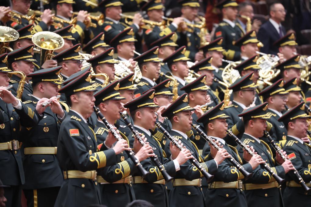 3月4日,全國(guó)政協(xié)十四屆三次會(huì)議在北京人民大會(huì)堂舉行開幕會(huì)。這是軍樂團(tuán)在演奏。