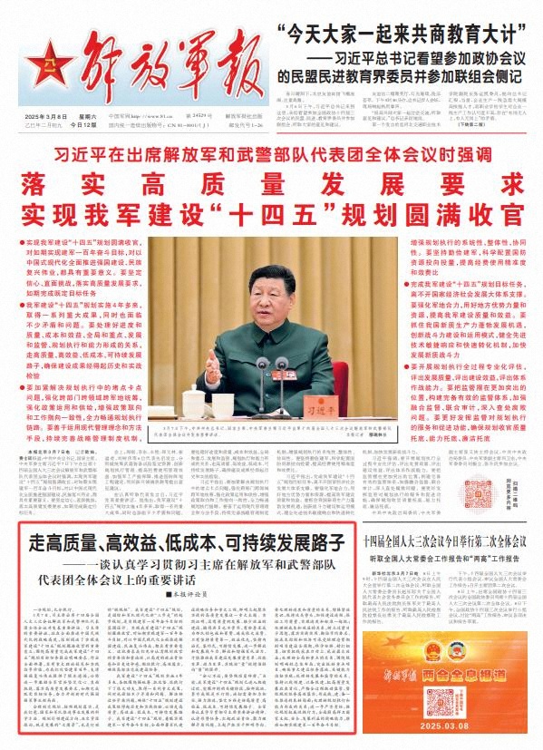 3月7日,習(xí)主席出席十四屆全國人大三次會議解放軍和武警部隊(duì)代表團(tuán)全體會議并發(fā)表重要講話。習(xí)主席的重要講話,站在全面推進(jìn)中國式現(xiàn)代化的戰(zhàn)略高度,深刻闡述了實(shí)現(xiàn)我軍建設(shè)“十四五”規(guī)劃圓滿收官的重要意義,圍繞高質(zhì)量完成我軍建設(shè)“十四五”規(guī)劃目標(biāo)任務(wù)提出明確要求、作出全面部署,具有重大理論創(chuàng)見和實(shí)踐指導(dǎo)價(jià)值,為我們攻堅(jiān)建軍百年、支撐強(qiáng)國復(fù)興偉業(yè)提供了根本遵循,必將進(jìn)一步激勵全軍官兵堅(jiān)定信心、直面挑戰(zhàn),落實(shí)高質(zhì)量發(fā)展要求,如期完成既定目標(biāo)任務(wù),奮力開創(chuàng)新時(shí)代強(qiáng)國強(qiáng)軍事業(yè)新局面。