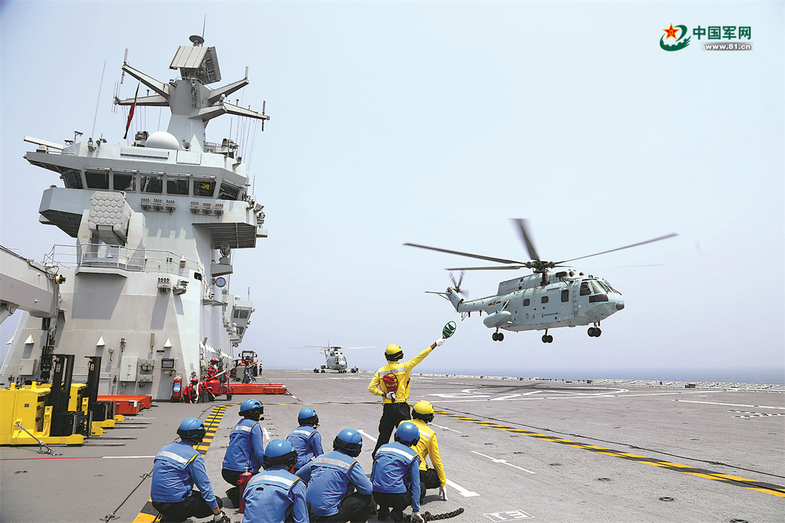 海南艦開展登陸訓練,甲板引導員對直升機進行引導。資料圖片