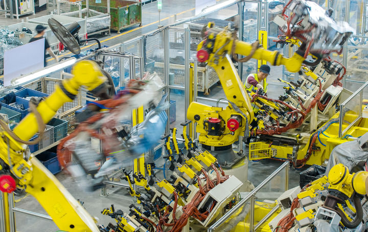 2025年10月9日,浙江省湖州市長興經(jīng)濟技術開發(fā)區(qū)的長興地通汽車部件有限公司技術人員操控工業(yè)機器人生產新能源汽車配件(無人機照片)。新華社發(fā)(譚云俸攝)