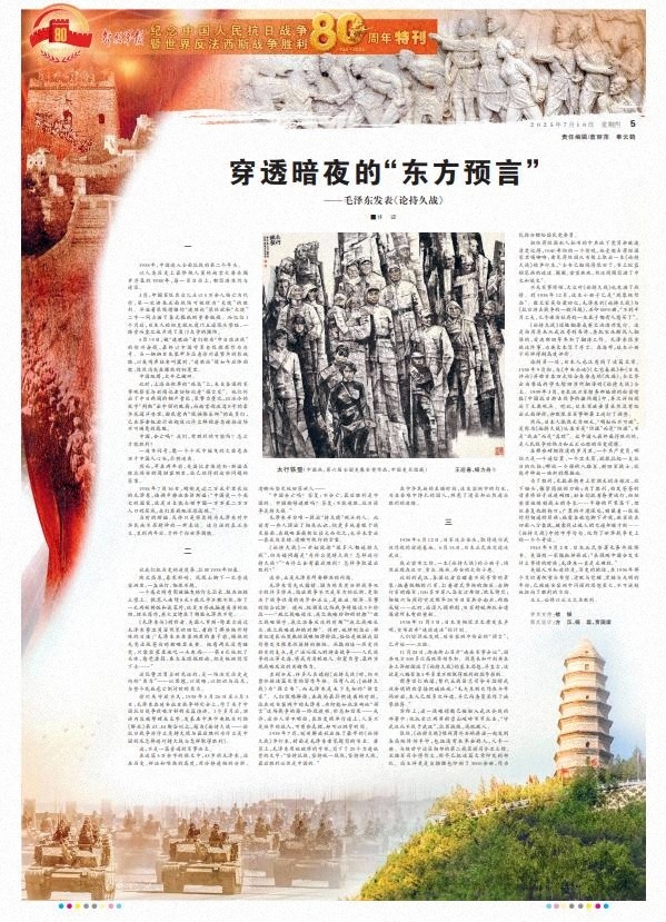 毛澤東首先從國情、國力的角度分析戰(zhàn)爭雙方的許多特點(diǎn),指出戰(zhàn)爭不只是軍力的抗衡,更取決于戰(zhàn)爭性質(zhì)的進(jìn)步和正義,是政治、經(jīng)濟(jì)、軍事的綜合比拼。進(jìn)而,他預(yù)見這場戰(zhàn)爭將經(jīng)過3個(gè)階段——“敵之戰(zhàn)略進(jìn)攻、我之戰(zhàn)略防御的時(shí)期”“敵之戰(zhàn)略保守、我之準(zhǔn)備反攻的時(shí)期”“我之戰(zhàn)略反攻、敵之戰(zhàn)略退卻的時(shí)期”。同時(shí),他特別指出:那看似漫長而煎熬的戰(zhàn)略相持階段,恰恰是敵強(qiáng)我弱形勢發(fā)生根本性逆轉(zhuǎn)的樞紐。而撬動(dòng)這一歷史性轉(zhuǎn)變的支點(diǎn),是廣泛而深入的游擊戰(zhàn)爭——人民戰(zhàn)爭的汪洋大海,將成為消耗敵人、積蓄力量、最終實(shí)現(xiàn)戰(zhàn)略反攻的關(guān)鍵偉力。