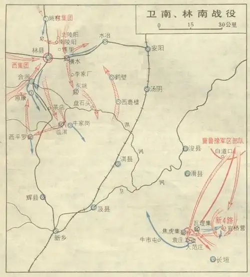 當(dāng)日夜,我軍集中力量對(duì)頭道營(yíng)之日軍據(jù)點(diǎn)展開(kāi)進(jìn)攻,敵人趁夜暗退往縣城南關(guān)據(jù)點(diǎn)待援。19日,林縣城郊外圍據(jù)點(diǎn)亦全部肅清。在西集團(tuán)向敵發(fā)起進(jìn)攻的同時(shí),我東集團(tuán)除準(zhǔn)備阻擊由安陽(yáng)出援之?dāng)惩?,先后攻占南北陵?yáng)、東西夏城、姚村等據(jù)點(diǎn)。20日,我東西兩集團(tuán)乘勝南下,擴(kuò)大戰(zhàn)果。東集團(tuán)收復(fù)東姚集,攻占李家廠,橫掃鶴壁集、西鹿樓以西地區(qū);西集團(tuán)收復(fù)合澗、原康,進(jìn)擊臨淇,攻克西平羅、南平羅。