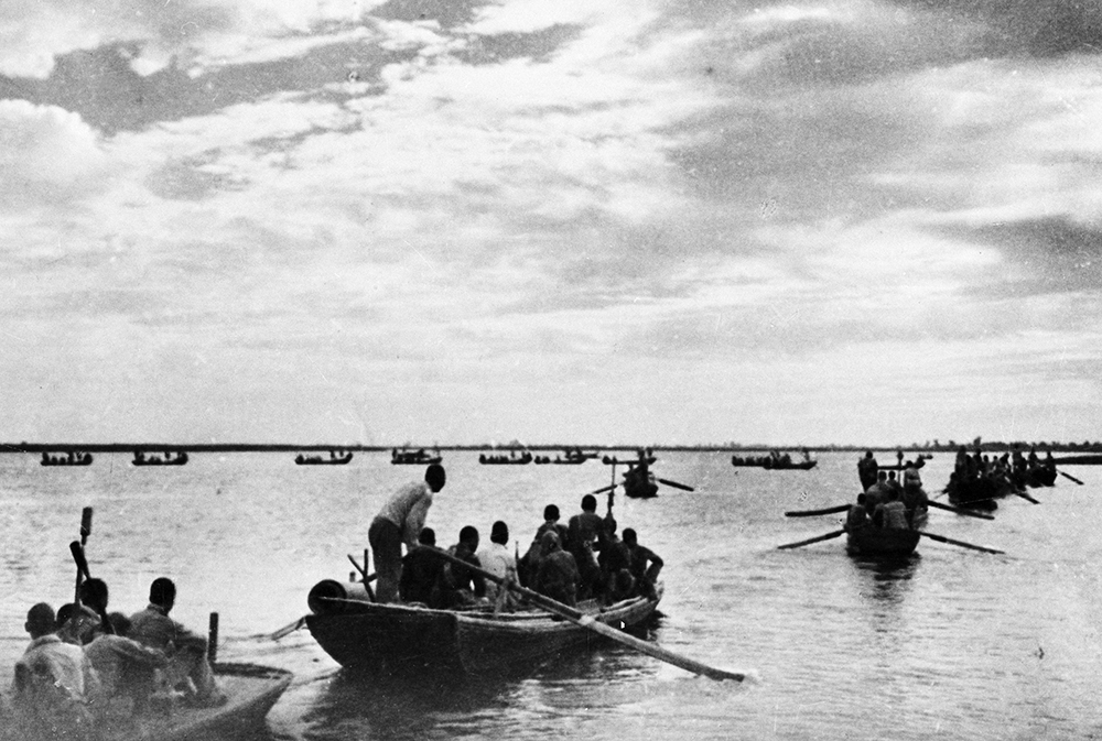 被稱作“雁翎隊(duì)”的白洋淀水上游擊隊(duì)隊(duì)員駕駛輕舟投入戰(zhàn)斗。