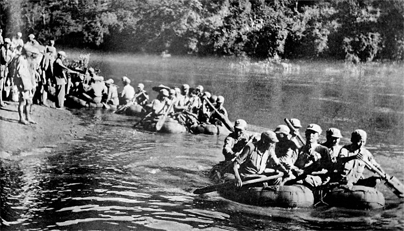 1944年5月,中國遠(yuǎn)征軍將士用帆布舟渡過怒江發(fā)起反攻。