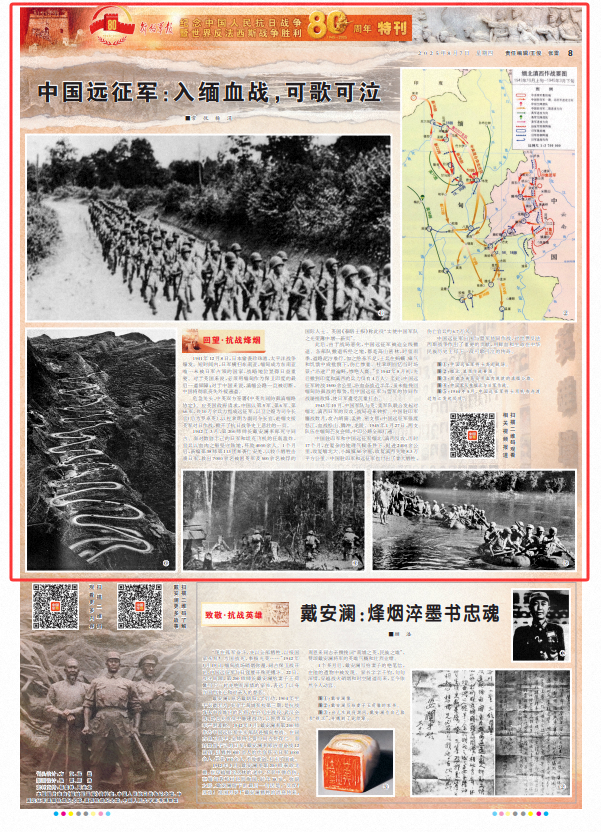 1942年3月,第200師師長戴安瀾率部死守同古。面對(duì)數(shù)倍于己的日軍和坦克飛機(jī)的狂轟濫炸,官兵以血肉之軀堅(jiān)守陣地,殲敵4000余人。1個(gè)月后,新編第38師第113團(tuán)奔襲仁安羌,以較小犧牲擊潰日軍,救出7000余名被困英軍及500余名被俘的國際人士。英國《泰晤士報(bào)》稱此役“實(shí)使中國軍隊(duì)之光榮簿中增一新頁”。