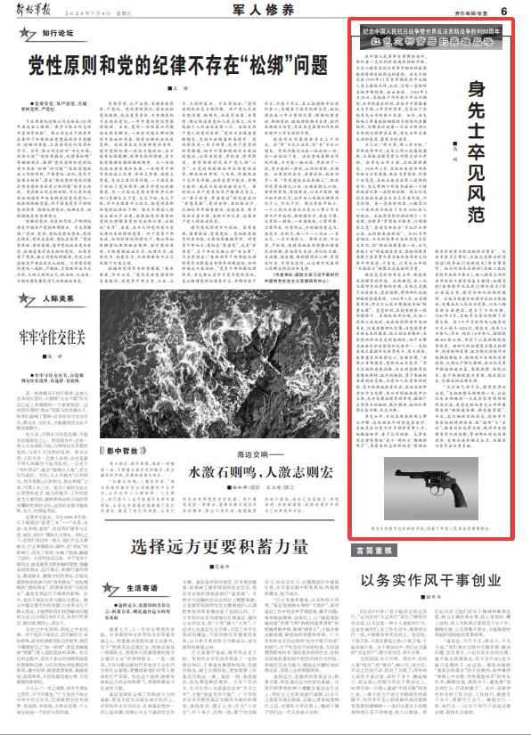 身先士卒,不僅表現(xiàn)在戰(zhàn)場(chǎng)上帶頭沖鋒,還體現(xiàn)在平時(shí)的走在前列。左權(quán)是我們黨不可多得的軍事人才,他勤奮好學(xué)、善于總結(jié)經(jīng)驗(yàn)。毛澤東同志曾夸贊他“是個(gè)‘兩桿子’都硬的將才”,周恩來(lái)同志評(píng)價(jià)他是“有理論修養(yǎng)同時(shí)有實(shí)踐經(jīng)驗(yàn)的軍事家”。無(wú)論軍務(wù)多么繁忙,左權(quán)總是擠出時(shí)間閱讀《戰(zhàn)爭(zhēng)論》《論新戰(zhàn)術(shù)》等軍事著作。他與劉伯承合譯的《蘇聯(lián)工農(nóng)紅軍的步兵戰(zhàn)斗條令》,被八路軍總部列為步兵戰(zhàn)斗教育的基本教材;他撰寫(xiě)的《論堅(jiān)持華北抗戰(zhàn)》《埋伏戰(zhàn)術(shù)》等40余篇文章,被作為部隊(duì)訓(xùn)練的教材。左權(quán)為創(chuàng)建并鞏固華北抗日根據(jù)地,發(fā)展壯大人民抗日武裝,以及八路軍的全面建設(shè),建立了不朽功勛。1940年8月,左權(quán)參與策劃指揮了百團(tuán)大戰(zhàn)。在3個(gè)半月時(shí)間內(nèi)八路軍進(jìn)行大小戰(zhàn)斗1824次,斃傷日、偽軍2.5萬(wàn)余人,俘日、偽軍1.8萬(wàn)余人,摧毀鐵路400余公里,書(shū)寫(xiě)了以弱制強(qiáng)的戰(zhàn)爭(zhēng)傳奇。新時(shí)代的指揮員應(yīng)像左權(quán)那樣,刻苦鉆研軍事,把實(shí)戰(zhàn)化訓(xùn)練作為練強(qiáng)指揮能力、練好戰(zhàn)斗本領(lǐng)的重要途徑,從難從嚴(yán)摔打磨礪,在日積月累中鍛造快速?zèng)Q策、果敢指揮、臨機(jī)應(yīng)變、善于協(xié)調(diào)的能力素質(zhì),練就能打仗、打勝仗的過(guò)硬本領(lǐng)。