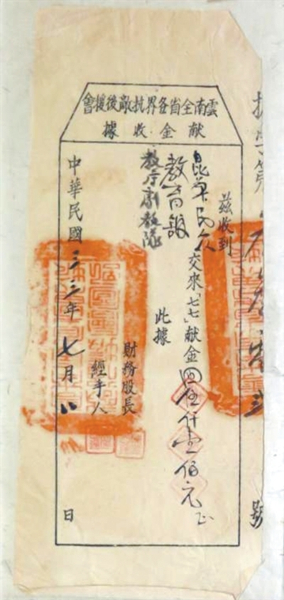 ▲昆華民眾教育館“七七”獻金收據(jù)?!∽T利剛供圖