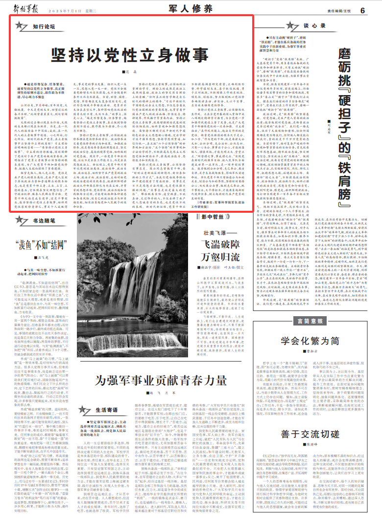 堅(jiān)持以黨性立身做事,必須始終注重理論學(xué)習(xí)。理論上的成熟是政治上成熟的基礎(chǔ),政治上的堅(jiān)定源自理論上的清醒?!叭魏握嬲恼軐W(xué)都是自己時(shí)代的精神上的精華?!绷?xí)近平新時(shí)代中國(guó)特色社會(huì)主義思想,不僅包含著我們黨治國(guó)理政的重要思想,也貫穿著中國(guó)共產(chǎn)黨人的政治品格、價(jià)值追求、精神境界、作風(fēng)操守等重要內(nèi)涵。堅(jiān)持以黨性立身做事,就要增強(qiáng)理論武裝的深刻性徹底性,始終重視和加強(qiáng)思想改造。要堅(jiān)持不懈用習(xí)近平新時(shí)代中國(guó)特色社會(huì)主義思想凝心鑄魂,突出學(xué)好習(xí)近平強(qiáng)軍思想,堅(jiān)持學(xué)思用貫通、知信行統(tǒng)一,真正把“六個(gè)必須堅(jiān)持”的世界觀和方法論、“五個(gè)堅(jiān)持”的軍事觀和方法論學(xué)到手,不斷提高馬克思主義思想覺(jué)悟和理論水平,提高政治能力、思維能力和實(shí)踐能力。
