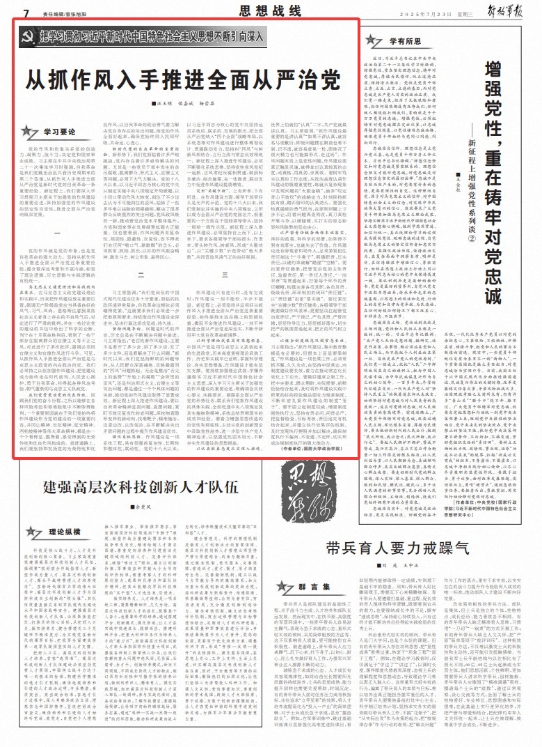 黨的作風(fēng)和形象關(guān)系黨的創(chuàng)造力、凝聚力、戰(zhàn)斗力,決定黨和國(guó)家事業(yè)成敗。習(xí)主席在中共中央政治局第二十一次集體學(xué)習(xí)時(shí)強(qiáng)調(diào),自我革命是我們黨跳出治亂興衰歷史周期率的第二個(gè)答案,從抓作風(fēng)入手推進(jìn)全面從嚴(yán)治黨是新時(shí)代黨的自我革命一條重要經(jīng)驗(yàn)。新征程上,我們要深入學(xué)習(xí)貫徹習(xí)主席關(guān)于加強(qiáng)黨的作風(fēng)建設(shè)的重要論述,保持加強(qiáng)黨的作風(fēng)建設(shè)的堅(jiān)定性自覺性,推進(jìn)全面從嚴(yán)治黨向縱深發(fā)展。