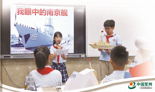 江蘇省南京市后標營小學的學生,向來寧參加“南京艦優(yōu)秀官兵看南京”活動的艦員代表介紹自己制作的南京艦?zāi)P?。張林芳攝
