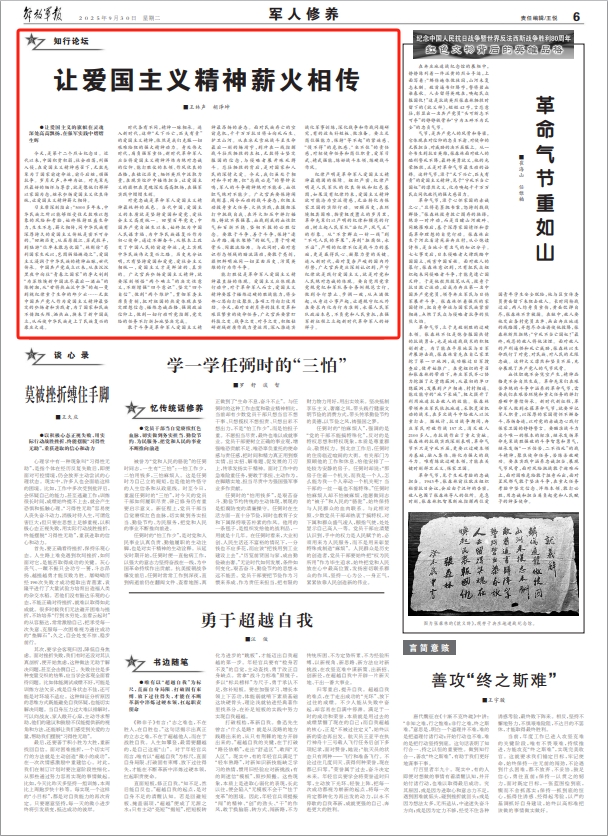 時代各有不同,精神一脈相承。進入新時代,這種“天下興亡,匹夫有責”的愛國主義精神,依然是我們克服一切艱難險阻的強大精神動力。身處偉大時代,肩負強軍重任,新時代革命軍人應當將愛國主義精神淬煉為絕對忠誠的信仰、能打勝仗的本領(lǐng)、作風優(yōu)良的品格,在銘記歷史、緬懷英烈中汲取力量,在現(xiàn)實熔爐中錘煉擔當,讓愛國主義的旗幟在靈魂深處高高飄揚,在強軍實踐中熠熠生輝。