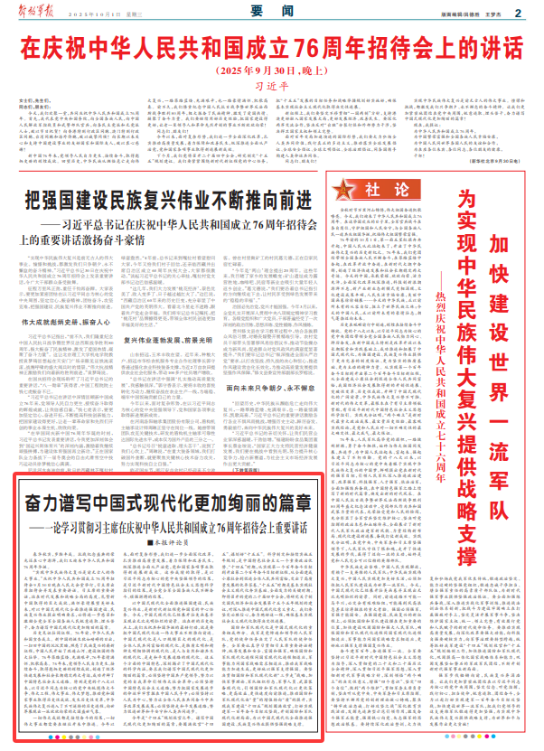 “實(shí)現(xiàn)中華民族偉大復(fù)興是前無古人的偉大事業(yè)?!睉c祝中華人民共和國成立76周年招待會9月30日晚在人民大會堂舉行,習(xí)主席出席招待會并發(fā)表重要講話。習(xí)主席的重要講話,站在時代發(fā)展和戰(zhàn)略全局的高度,禮贊新中國取得的巨大成就,滿懷豪情展望美好未來,對以中國式現(xiàn)代化全面推進(jìn)強(qiáng)國建設(shè)、民族復(fù)興偉業(yè)提出明確要求,必將進(jìn)一步感召和激勵全黨全軍全國各族人民銳意進(jìn)取、埋頭苦干,奮力譜寫中國式現(xiàn)代化更加絢麗的篇章。