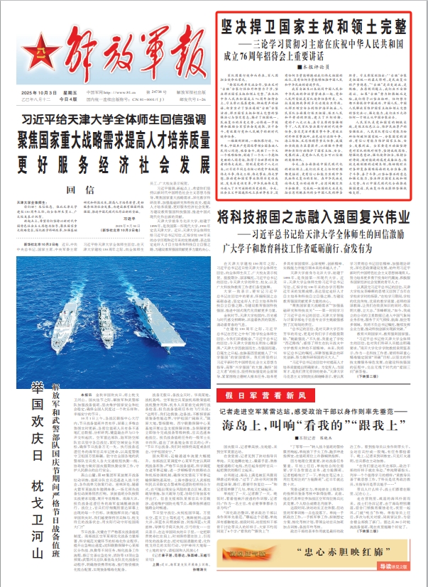 “要深化兩岸交流合作,堅(jiān)決反對(duì)‘臺(tái)獨(dú)’分裂行徑和外部勢(shì)力干涉,堅(jiān)決捍衛(wèi)國(guó)家主權(quán)和領(lǐng)土完整?!痹趹c祝中華人民共和國(guó)成立76周年招待會(huì)上,習(xí)主席以高屋建瓴、擲地有聲的話語,鄭重宣示了堅(jiān)決遏制“臺(tái)獨(dú)”分裂活動(dòng)、捍衛(wèi)國(guó)家主權(quán)和領(lǐng)土完整的堅(jiān)強(qiáng)決心與堅(jiān)定意志,揭示了祖國(guó)統(tǒng)一、民族復(fù)興的歷史大勢(shì),必將進(jìn)一步鼓舞和激勵(lì)全軍官兵奮發(fā)進(jìn)取、實(shí)干奮斗,有效履行黨和人民賦予的新時(shí)代使命任務(wù)。