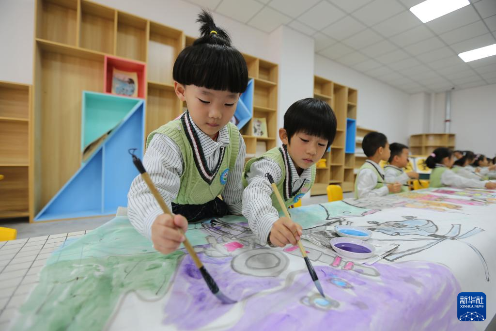 9月28日,甘肅省定西市安定區(qū)幼兒園的小朋友在繪制《我愛你中國》長卷。