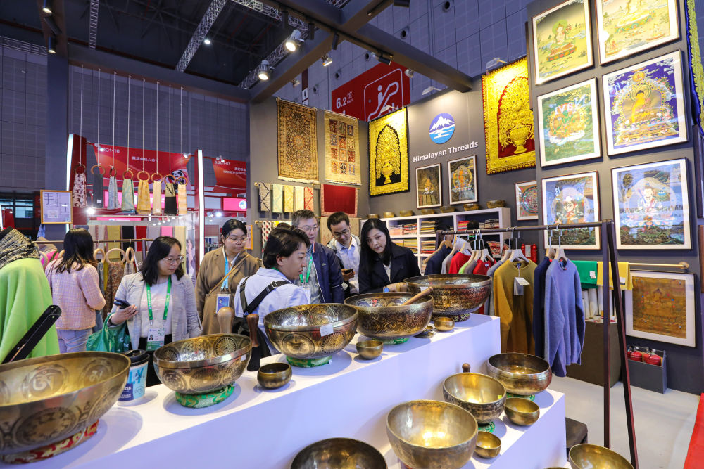 2023年11月7日,在第六屆進(jìn)博會(huì)消費(fèi)品展區(qū),參觀者在挑選來(lái)自尼泊爾的商品。新華社記者 辛夢(mèng)晨 攝