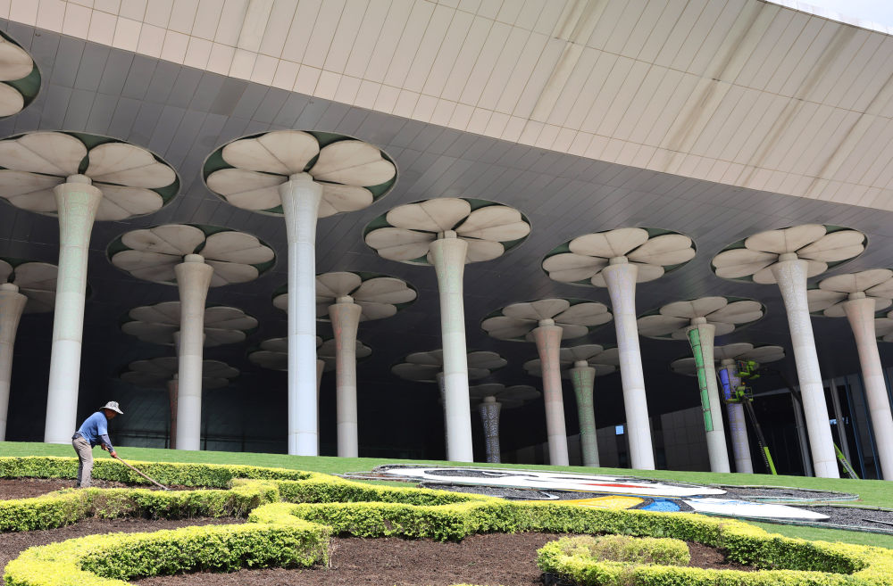 2025年10月5日,工人在國(guó)家會(huì)展中心(上海)南廣場(chǎng)花壇作業(yè)。新華社記者 方喆 攝