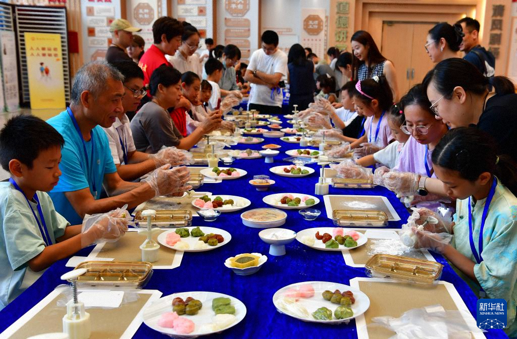 10月6日,在江蘇省揚州市何園景區(qū),小朋友們在工作人員的指導(dǎo)下體驗制作月餅。新華社發(fā)(孟德龍攝)
