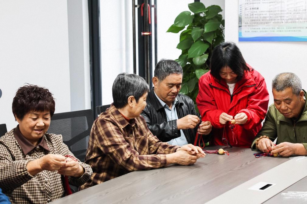 10月21日,志愿者教老人制作小葫蘆掛件。