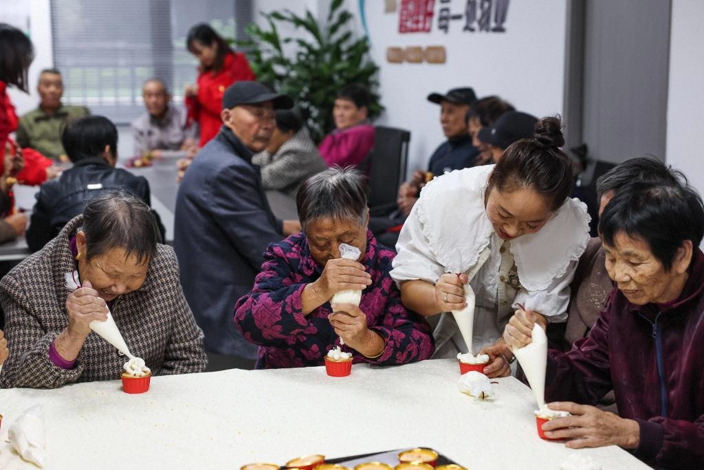 10月21日,志愿者在教老人制作紙杯蛋糕。