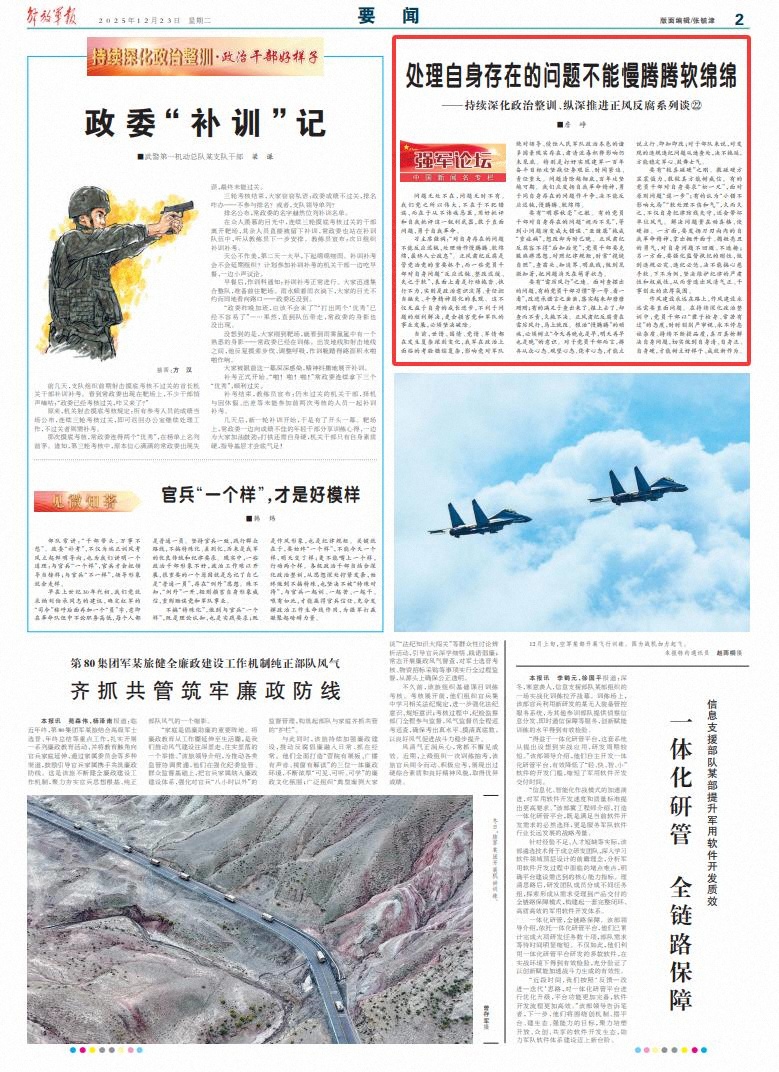 當(dāng)前,世情、國情、黨情、軍情都在發(fā)生復(fù)雜深刻變化,我軍在政治上面臨的考驗錯綜復(fù)雜,影響黨對軍隊絕對領(lǐng)導(dǎo)、侵蝕人民軍隊政治本色的諸多因素現(xiàn)實存在,肅清流毒積弊影響仍未見底。特別是打好實現(xiàn)建軍一百年奮斗目標(biāo)攻堅戰(zhàn)任務(wù)艱巨、時間緊迫、責(zé)任重大。問題清除越徹底,百年攻堅越可期。我們應(yīng)發(fā)揚(yáng)自我革命精神,勇于同自身存在的問題作斗爭,決不能反應(yīng)遲鈍,慢騰騰、軟綿綿。