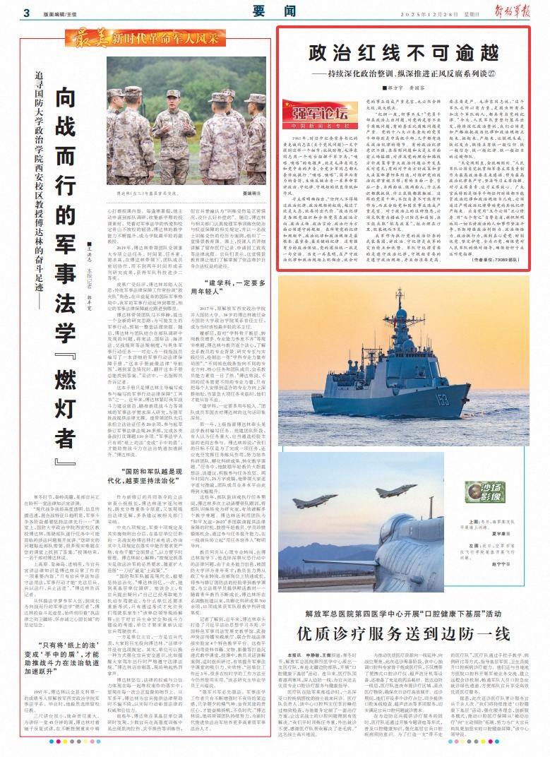 “木受繩則直,金就礪則利。”人民軍隊必須自覺把貫徹軍委主席負責制作為最高政治要求來遵循、作為最高政治紀律來嚴守,堅決聽習主席指揮、對習主席負責、讓習主席放心。廣大官兵特別是領導干部任何時候都不能拿政治紀律和政治規(guī)矩當兒戲,必須通過嚴明政治紀律帶動黨的其他紀律嚴起來。應自覺用“五個必須”正心修身、用“七個有之”自警自省,旗幟鮮明地同一切不講政治的人和事作堅決斗爭,不斷增強政治判斷力、政治領悟力、政治執(zhí)行力,做到真心愛黨、時刻憂黨、堅定護黨、全力興黨,確保黨對人民軍隊的絕對領導,確保槍桿子永遠聽黨指揮。