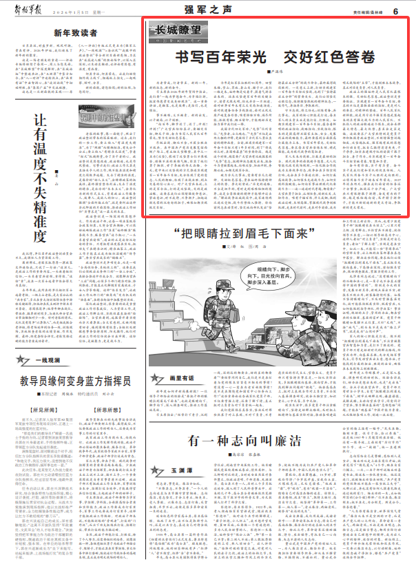政治上的強(qiáng)始終是人民軍隊(duì)最根本的強(qiáng)。交好紅色答卷,政治整訓(xùn)是重要保證。實(shí)現(xiàn)建軍一百年奮斗目標(biāo),要求的不僅是器物層面的指標(biāo),更是對(duì)人的要求、對(duì)精神的塑造。百年人民軍隊(duì)新樣貌,就是用習(xí)近平強(qiáng)軍思想武裝起來(lái)的具有強(qiáng)大戰(zhàn)斗力的人民軍隊(duì)。不抓住人的政治鍛造這個(gè)根本,就會(huì)丟掉最大特色、最大優(yōu)勢(shì),甚至?xí)咄嶙咂?。這就要求廣大官兵特別是黨員干部積極投身政治整訓(xùn),不斷增強(qiáng)整訓(xùn)越徹底、攻堅(jiān)越托底、強(qiáng)軍越有底的思想和行動(dòng)自覺(jué),把自己搞得清清爽爽、干干凈凈,切實(shí)在遵規(guī)守紀(jì)的前提下敢于擔(dān)當(dāng)、善于作為,為實(shí)現(xiàn)建軍一百年奮斗目標(biāo)貢獻(xiàn)青春、智慧和力量。