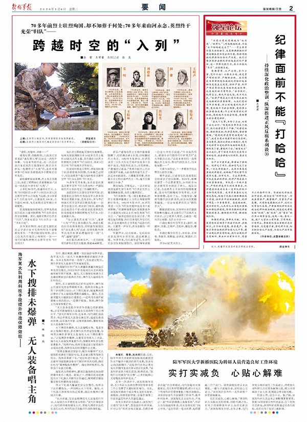 令嚴(yán)方可肅軍威,命重始于整綱紀(jì)。紀(jì)律之于軍隊,猶如空氣之于生命,一刻也不能缺少。我軍歷來高度重視紀(jì)律建設(shè),始終把嚴(yán)明紀(jì)律作為建軍之基、治軍之本。習(xí)主席強調(diào),軍隊是最講紀(jì)律的,紀(jì)律嚴(yán)明是戰(zhàn)斗力的重要源泉。軍隊是一個戰(zhàn)斗集體,嚴(yán)明紀(jì)律是軍隊的本質(zhì)要求,紀(jì)律建設(shè)的成效關(guān)系一支軍隊的戰(zhàn)斗力和作風(fēng)形象。我軍歷來善打大仗硬仗惡仗,創(chuàng)造了無數(shù)以弱勝強的戰(zhàn)斗奇跡,分析其中的制勝機理,紀(jì)律嚴(yán)明是一個重要原因。奮進(jìn)新征程,建功新時代,人民軍隊必須更加重視和加強紀(jì)律建設(shè),堅持用鐵的紀(jì)律凝聚鐵的意志、錘煉鐵的作風(fēng)、鍛造鐵的隊伍。
