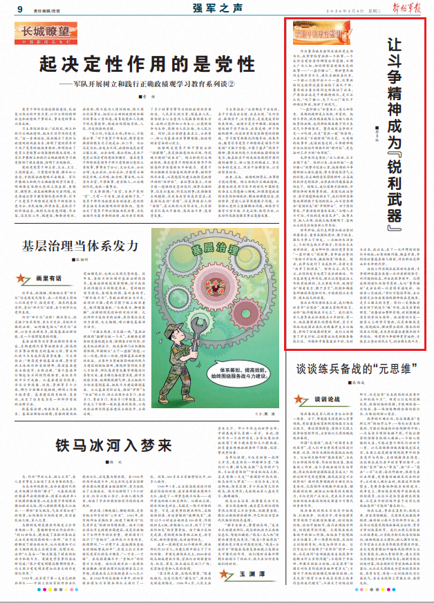 這些工作實踐讓我深刻體會到,斗爭精神就蘊含在每一次對原則的堅守、對問題的較真、對自我的革新中。記得我剛到連隊任指導員時,與從“董存瑞班”走出去的一位老將軍通電話。他語重心長地說:“你們可能還年輕,未必能夠完全體會英雄的精神烙在靈魂里,是多么強大的力量。你們一定要把老班長傳下的這個‘魂’守住,這是寶貴的財富。”這番話如警鐘長鳴,時刻提醒我肩負的責任與使命。政治整訓不是一般意義上的學習整改,而是要觸及靈魂、深挖病灶,解決帶全局性、根本性的深層次問題,其本身就蘊含著強烈的斗爭指向。唯有將斗爭精神貫穿始終,才能真正整出新風正氣,訓出強大戰(zhàn)斗力。