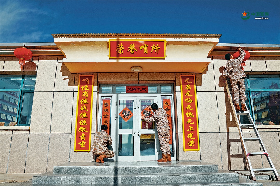 火箭軍某部騎兵連9號(hào)哨所官兵懸掛燈籠、張貼春聯(lián)。高翔 攝